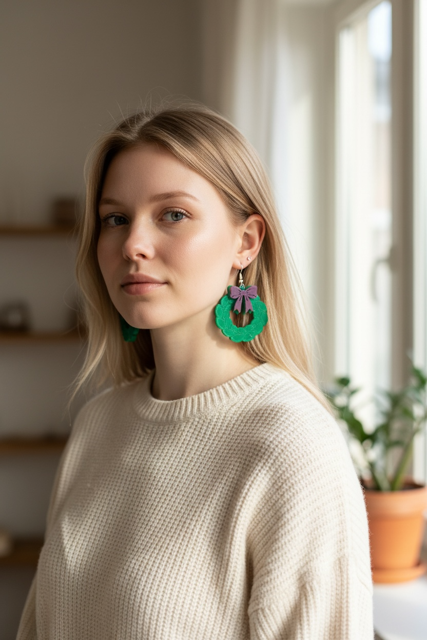 Deck the halls with festive flair! These charming Christmas wreath earrings feature a delicate wreath design adorned with a cheerful bow, perfect for spreading holiday cheer. The dangling style adds movement and sparkle to any seasonal outfit, making them an instant conversation starter at parties and gatherings. Whether you're dressing up for a holiday celebration or adding a touch of Christmas spirit to your everyday look, these earrings bring joy and whimsy to your jewelry collection. A must-have accessory for anyone who loves the magic of the season!